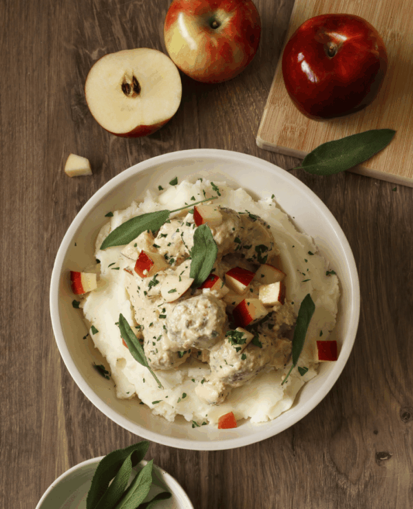 5. 準備上菜時,將煮熟的肉丸加入奶油醬汁中,再加入1個切碎的… Cosmic Crisp® 蘋果放在上面,攪拌均勻即可享用!